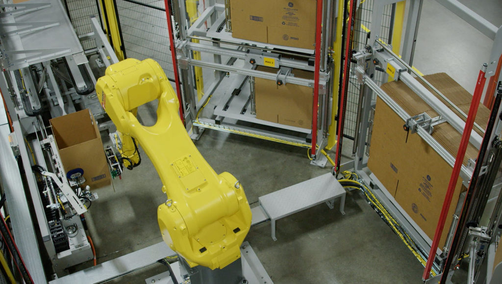 This Random Robotic Case Erector can form up to 6 different case sizes. With a compact footprint, the cell is comprised of (3) ergonomically-designed dual case magazines that can be easily refilled without disrupting production. This cell also incorporates a third-party labeler.