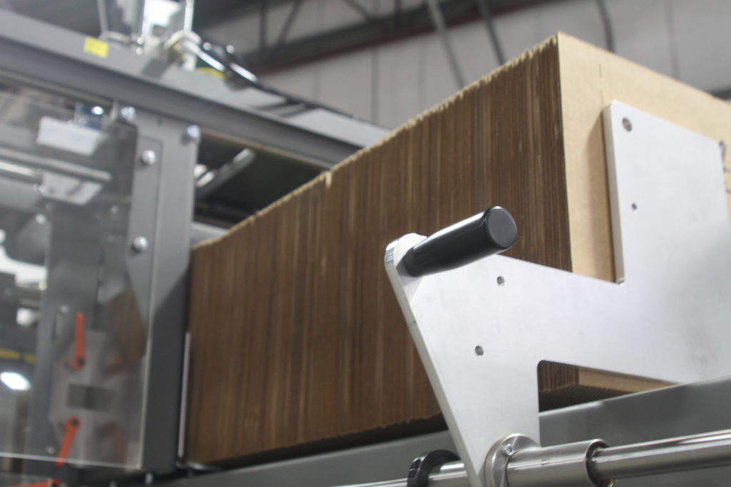 The extended feed system replenishes the primary material hoppers. As it nears depletion, the conveyor is activated and a stack of die cut corrugate is deposited into the primary hopper. Body wrap stack transfer systems can double or triple overall material capacity, while H-divider stack transfer magazines can more than quadruple the standard machine capacity.